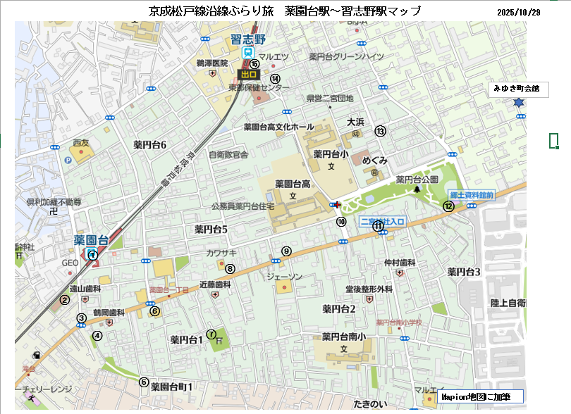 ①薬園台駅 → ②旧薬園台駅跡 → ③立場商店・宍倉七右衛門宅跡 → ④高幢庵 → ⑤薬園台町 → ⑥秋山好古住居跡 → ⑦神明神社 → ⑧田中豆腐店 → ⑨庚申塚 → ⑩東部軍管区教育隊表門跡 → ⑪南無不動明王 → ⑫郷土資料館 → ⑬クアパレス →⑭ 東部軍管区教育隊裏門跡 → ⑮習志野駅
