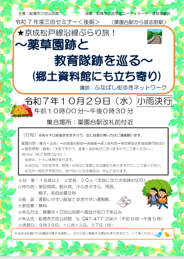 講座は全3回シリーズとし山本稔氏を講師に迎え、1回目は5月29日に座学で「船橋ってどうやってできたの?」、第2回目は6月5日に散策で鎌ヶ谷市との市境「丸山を回る」、第3回目も散策で6月12日に市川市との市境「下総中山発 法華経寺と真間川へ」とした。講師の山本氏は船橋地名研究会会員で、自称江戸・東京案内人として活躍されている郷土史研究家である。今回の講座は定員20名で募集を開始し、すぐに満員になった。